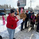 Des travailleuses et travailleurs de la santé manifestent devant le bureau du député Dave Smith contre les coupes dans les hôpitaux qui nuisent au personnel et aux patient(e)s