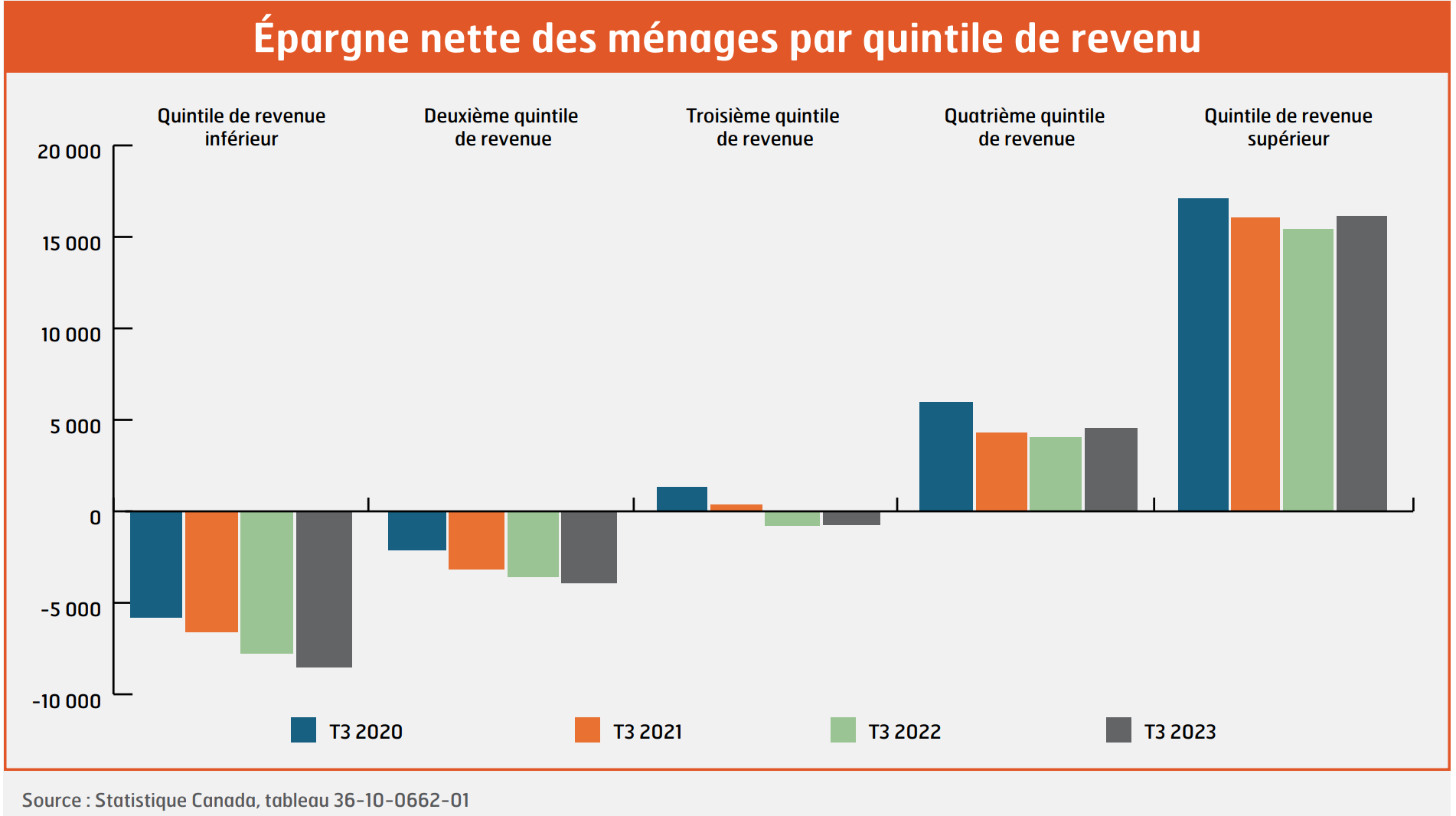 Un autre indicateur important est le ratio de la dette des ménages par rapport au PIB, qui mesure la valeur de l’endettement des ménages canadiens par rapport à la taille de notre économie. Parmi les dix plus grandes économies dans le monde, c’est au Canada que ce ratio est le plus élevé. En effet, il est égal ou supérieur à 100 % depuis plus d’une décennie. Les hypothèques représentent environ 75 % des dettes des ménages; le reste comprend les cartes de crédit, les prêts automobiles et les autres formes de dettes personnelles ou pour petites entreprises. Au Canada, notre dette personnelle mensuelle croît plus rapidement que notre salaire net. Ce n’est pas surprenant que les écarts en matière de fortune et d’épargne se creusent entre les ménages aux revenus les plus élevés et les plus faibles.