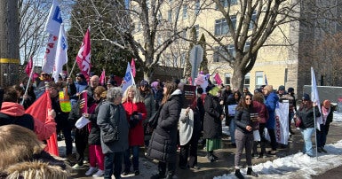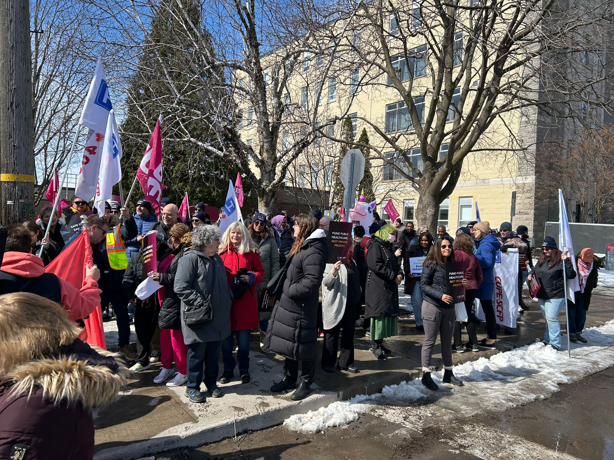 Frustré par la détérioration des conditions à l’hôpital, et atterré par l’annonce récente d’une suppression d’emplois, le personnel de la santé à Santé Bruyère a tenu un rassemblement à l’extérieur de l’Hôpital Saint-Vincent le lundi 23 mars dernier. Plus de 100 personnes s’y sont rassemblées, notamment des membres du personnel hospitalier appartenant à d’autres sections locales du SCFP dans la région.