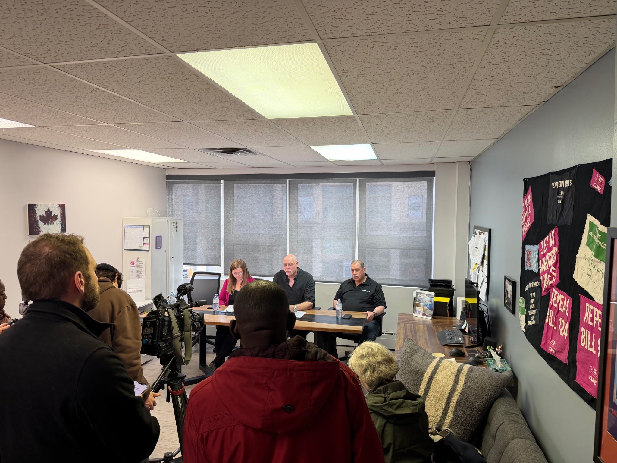 Michael Hurley, président du Conseil des syndicats d’hôpitaux de l’Ontario affilié au SCFP, pointe du doigt le gouvernement provincial pour ces compressions budgétaires imposées aux hôpitaux, compressions qui pénalisent les patient(e)s vulnérables ainsi que les travailleuses et travailleurs.