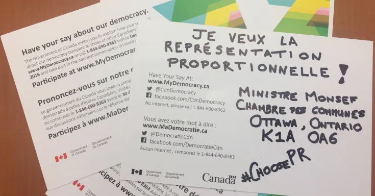 Des citoyens utilisent leurs cartes postales fédérales pour envoyer un message simple mais important à la ministre des Institutions démocratiques : « Nous voulons la représentation proportionnelle. »